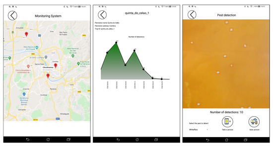 The mobile application was developed using React Native, and allows the user to monitor pests through a mobile device (see Figure 11). For that, the user can choose a plantation site and a specific edge node (one of the ESP32-CAMs) on a map. For that node, the user can see the evolution of the detected pests and the images obtained for each day. The middle image shows a pest evolution where the traps were changed almost every day. To complement this approach, it is also possible to take a photo of a trap, which is sent to the backend part of the IoT network. Then, the CV model makes the detection and returns results to the application.