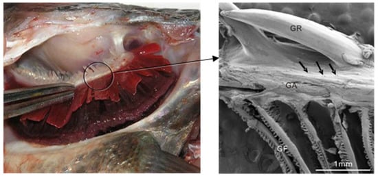 Gill morphology in carp (cyprinus carpio): left, photo of a carp gill; right, close-up (GR: gill rakes; GA: gill arches; GF: gill filaments).