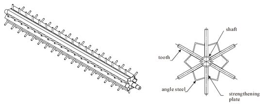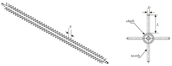 Therefore, the diameter of the feeding roller is designed as 60 mm. The length and diameter of the feeding teeth are 120 mm and 18 mm (as shown in Figure 3), respectively, which can be calculated from the above procedures considering the equipment dimensions.