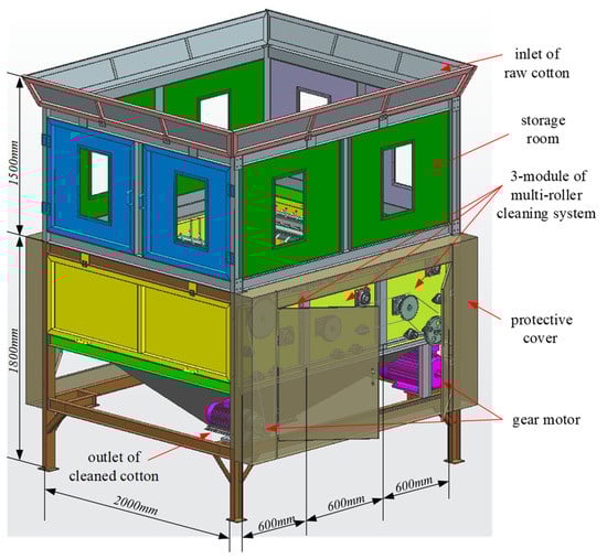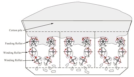 As shown in Figure 7, the developed LFM cleaning equipment is able to gather and clean all of the LFM at intervals. The cotton can be fed from the top rollers and cleaned by the winding rollers. Moreover, jamming among teeth can be avoided owing to the comb-like structure.