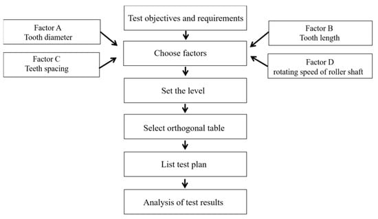 In this study, the factors that affect the cleaning efficiency of the winding rollers are investigated based on the OED method. The experimental process of the OED method is shown in the Figure 6. As shown in Table 2, four factors, including the diameter (Factor A), length (Factor B), and spacing (Factor C) of the teeth and the rotating speed of the roller shaft (Factor D) are investigated, and three levels of each factor are defined. Here, is employed to assign the considered factors, as shown in Table 3, which is an orthogonal sequence of the four factors with three levels each. Nine trials were carried out to achieve the optimization process according to . More importantly, the OED method can reduce the required number of experiments from 81 to 9. Every experiment with different levels of the factors has been tested in practice, and the corresponding amount of LFM was measured and listed after processing.
