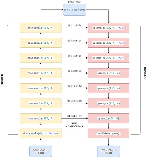 As seen from Figure 1, every downsample, other than the first downsample, has a skip connection to its upsample pair. Note that the upsample will accept two inputs. Input from the previous upsample output and from the downsample output. These two inputs have the exact dimensions and will be concatenated. For example, the first upsample will accept two inputs with dimensions of 1 × 1 × 512, and after concatenation, the dimensions become 1 × 1 × 1025.