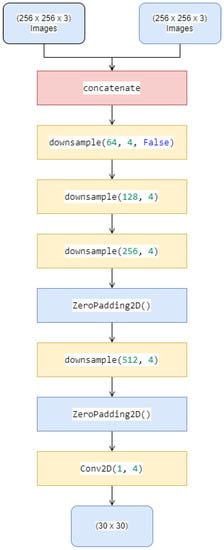 In this study, the discriminator produced a final result with dimensions of 30 × 30. Each grid had a value between 0 and 1, which indicated the fake and the real image, respectively, as seen in the final output of Figure 2. Each grid represented the original image patch with a size of 70 × 70. The classification results were then be compiled and used to calculate the discriminator loss.