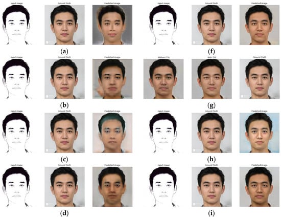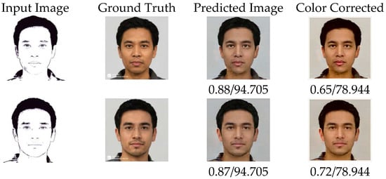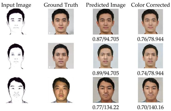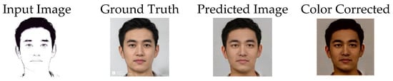 As shown in Figure 4, the images produced by cGAN-TV tended to have a similar skin tone. Hence, a color correction was required to make the photo images more realistic and more in accordance with the ground truth. By applying the configuration contained in Table 2, the resulting image could be more visually similar to the original image.