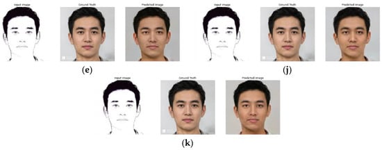 Visual result of each scenario. (a–k) Visual result of scenario a–k, respectively; (g) is the result of pix2pix (baseline method) [8]. The ground truth images are from generated photos [17].