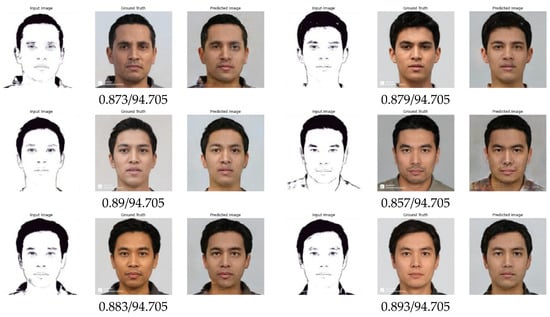 The experiment was carried out by varying the and , which are the weight for and TV terms. Other parameters, such as the number of epochs and the dataset, will be equalized. The number of paired data used was 1365, divided into training and validation datasets. The selection of the validation dataset was done randomly and the number of datasets to be used for validation was 10. This number is relatively very small because the GAN generative model requires a lot of data for the training process. In some references, the paired data used in the training process number from tens to tens of thousands [7,10,11,12,28]. Therefore, in the experiment, we maximized the number of paired data for the training process; the cGAN-TV results can be seen clearly and analyzed correctly. In addition, we also prepared 68 testing datasets containing images of real Indonesian people obtained from photographs of students from the Department of Electrical Engineering, University of Indonesia, and several images from compiled datasets. The 68-testing dataset was used because it refers to the GAN study conducted by Chen et al. [21] where they used 5% testing of the total training data.