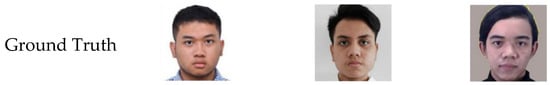 Table 4 shows the SSIM and FID evaluation values from the validation and testing datasets. It can be observed that the SSIM value generated from the testing dataset was 0.06 lower than that of the validation dataset. The obtained FID value was also higher than that of the validation dataset. This is because the photo images in the testing dataset came from real data and had never been seen before by the model. Meanwhile, the validation data was collected from the same source as the training dataset. The validation and training datasets had the same face size, head position, and lighting. While the test dataset had a slightly different configuration.