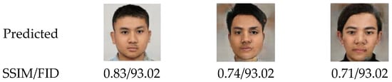 Figure 5 shows three examples of the results of the testing phase. Visually, the generator could create a similar image, but the result was not as good as the validation dataset. This is because the character of the images in the training dataset was quite different from those in the testing dataset, which were collected from real persons. In addition, this was caused by the sketch dataset used, which was not perfectly generated. However, our GAN was able to create images that were quite similar to the corresponding original images, with SSIM values of 0.83, 0.74, and 0.71, with an FID of 93.02.