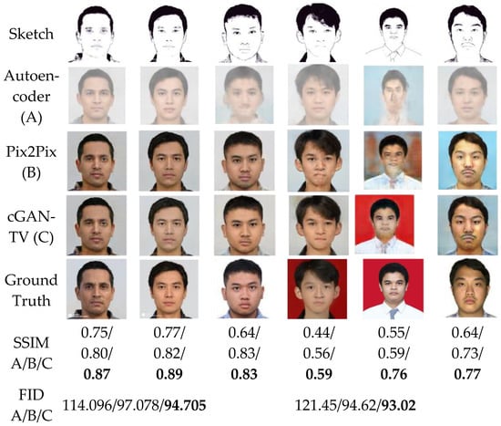It should be noted that the SSIM value was calculated by comparing the grayscale structure of the image generated by the generator and the original image of the sketch. In comparison, the FID value was achieved by comparing the two distributions of the entire validation image generator with the distribution of all the original images. The color difference in the image would greatly affect the FID value while having no impact on the SSIM value. Therefore, every time an evaluation was carried out, the SSIM would not change, while the FID would always change because the generator results would generate random background and skin tones.
