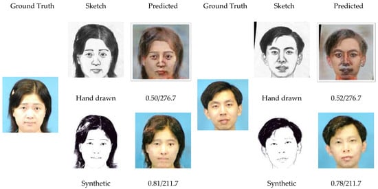 Because the number of labelled data with hand-drawn sketches has not been adequate for training the GAN-based model, this research used synthetic sketches. Meanwhile, generating images from arbitrary hand-written sketches is a very challenging task because the accuracy depends on the person drawing the sketch and the roughness of the sketch. To examine the generalization capability of our model when it comes to the hand-drawn sketch input that resembles the original to some extent, we tested it using hand-drawn sketches from the CUHK dataset [20]. The results are depicted in Figure 10. These show that the system has a certain degree of versatility.