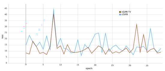 To evaluate the influence of TVL in the learning process, we observed the loss behavior along the epochs produced by cGAN (with L_1 loss) and cGAN-TV. As depicted in Figure 11, cGAN-TV successfully decreased the loss of cGAN. Every point of the curves represents the loss of every 1000 epochs that reach values between 6–45. The values are relatively large due to the value of λ_1, which is 100. Despite the fluctuation, cGAN-TV obtained loss values that are mostly lower than those of cGAN, including at the last epoch. In the beginning of the training, cGAN-TV reached the lowest loss, however, the generated images were still far from realistic features, where the overfitting occurred at this epoch, as shown in Figure 12. This shows that a cGAN-based model needs a huge number of epochs to generate an optimal result.