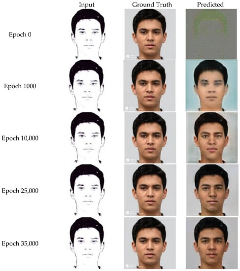 The training stage took approximately two hours and was carried out for 40,000 epochs, where, for every 1000 epochs, we displayed the temporary results of the cGAN-TV using one of the validation sketch images. This aimed to monitor the progress of the cGAN-TV more efficiently so that the training process could be manually stopped if it produced unexpected results, such as over smoothing.