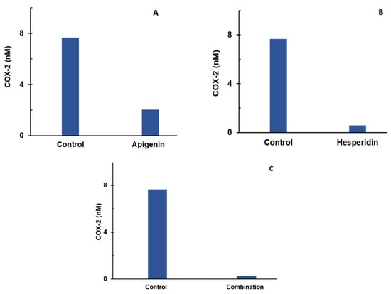 The levels of COX-2 were estimated to be 7.62 nM for the control condition. At the end of a 2-day period, COX-2 concentrations reduced to 2.2 nM in the presence of 30 mg of apigenin, as shown in Figure 3A. In the presence of 1000 mg of hesperidin, COX-2 concentrations reduced to 0.58 nM over a period of 2 days, as shown in Figure 3B. When combined, apigenin and hesperidin lowered COX-2 levels even further to 0.28 nM (Figure 3C).