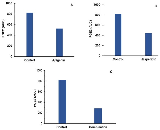 The levels of PGE2 were estimated to be 823 AUC for the control condition. At the end of a 2-day period, PGE2 concentrations reduced to 526 AUC in the presence of 30 mg of apigenin, as shown in Figure 4A. In the presence of 1000 mg of hesperidin, PGE2 concentrations reduced to 447 AUC over a period of 2 days, as shown in Figure 4B. When combined, apigenin and hesperidin lowered PGE2 levels even further to 286 AUC (Figure 4C).