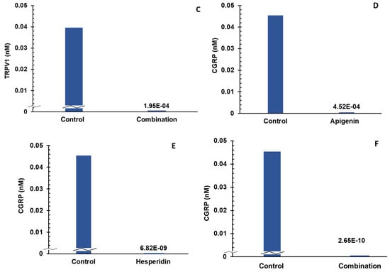 The levels of CGRP were estimated to be 0.045 nM for the control condition. At the end of a 2-day period, CGRP concentrations reduced to 0.0004 nM in the presence of 30 mg of apigenin, as shown in Figure 5D. In the presence of 1000 mg of hesperidin, CGRP levels reduced to 6.82 × 10−9 nM over a period of 2 days, as shown in Figure 5E. When combined, apigenin and hesperidin lowered CGRP levels even further to 2.65 × 10−10 nM (Figure 5F).