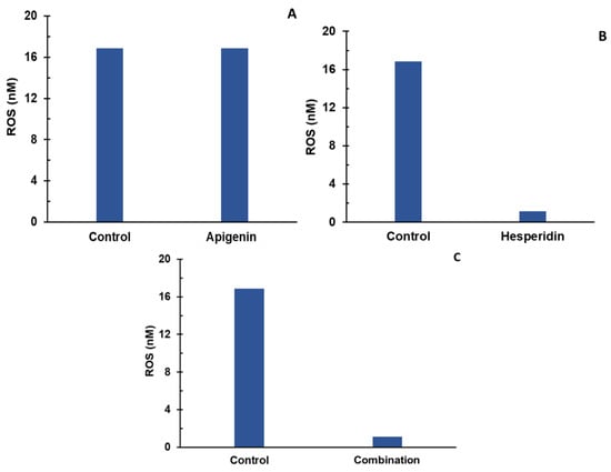 Apigenin and hesperidin targeted the oxidative stress signaling pathway. The effect of apigenin and hesperidin individually is shown in panels A and B, respectively, and results from their combination are shown in Figure 6C. ROS levels were compared over a period of 2 days in the presence and absence of apigenin and hesperidin.