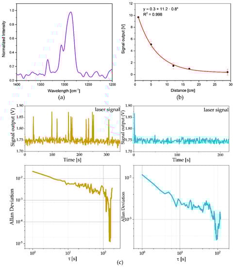 Characteristics of the Fabry–Pérot laser. (a) The emission spectrum of the laser treated with a seven-point FFT filter; (b) Signal decay as a function of distance between laser and detector. (c) Exemplary tryptophan spectra (top) and Allan variance of the laser (bottom). The colors are in accordance with Figure 4b, indicating the different measurements (yellow is the third measurement in Figure 4b and blue is the second measurement in Figure 4b).