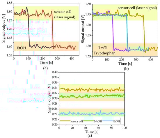 The developed sensor assembly has already been successfully used during previous studies []. Here, the RobustATR is coupled to a QCL (uniMir, mirSense, Palaiseau, France) pack aged within a miniature housing facilitating future portable sensing applications. As shown in Figure 2a, the laser is coupled via a hollow-core fiber to the developed sensor assembly and the detector is directly located at the distal end of the transducer. To test the feasibility of this setup, analytes with vibrational signatures around 1300 cm−1 have been selected. As an example of environmentally relevant analytes, ethanol was selected as the model constituent. Although ethanol does not have its most characteristic peaks in this wavelength regime, it exhibits some broad features. Characteristic ethanol signatures in this region are the peaks at 1391 cm−1 [], which corresponds to the OH bending mode, and 1242 cm−1 [], which is associated with the CH3 bending mode. To record the signal change between the background and the analyte, the analyte was added onto the IRE while data was recorded (see Figure 4a). Applying ethanol onto the crystal leads to a decrease of the signal output. However, the ethanol signal is still higher than the background noise at a value of approximately 0.03 V.