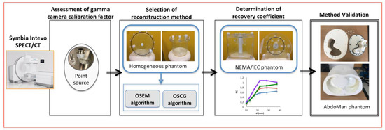 - Selection of reconstruction method: using the calibration factor derived from the previous step, data acquisition of a homogeneous cylindrical phantom was performed in order to assess the best reconstruction method. Two algorithms were tested (the OSEM and OSCG algorithm) using the built-in quantitative xSPECT package. The selected algorithm was then used to reconstruct raw data in step (3) and (4);