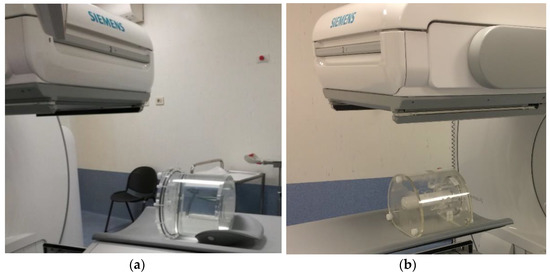 Two reconstruction methods were compared using a cylindrical phantom filled with water uniformly mixed with radioactive 99mTc following the procedure reported in [17]. The cylindrical phantom was 17 cm long and 22 cm in diameter for an inner volume of 6862 mL (Figure 2a, Table 1). A total activity of 205.9 MBq was injected in the volume, thereby obtaining a final activity concentration of 0.030 MBq/mL.