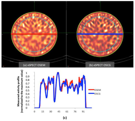 Examples of data reconstructed with (a) OSCG and (b) OSEM algorithm in xSPECT software for the homogeneous phantom are shown in Figure 6.