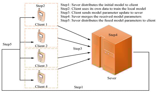 Federated learning is an algorithm that does not need to directly fuse multi-party data for training and only needs to encrypt and exchange client model parameters to train a high-performance gl. Therefore, federated learning can meet the requirements of user privacy protection and data security. Figure 1 is an example of a federated learning architecture that includes a coordinator. In this scenario, the coordinator is an aggregation server, which can send the initial random model to each client. The clients use their respective models to train the model and send the model weight updates to the aggregation server. After that, the aggregation server aggregates the model updates received from the client and sends the aggregated model updates back to the client. Under this architecture, the client’s origin is always stored locally, which can protect user privacy and data security [21,22,23,24,25,26].