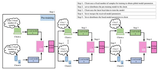 In addition, in traditional federated learning, the initial parameters of the global model are all randomly generated numbers, which will affect the convergence speed of the model. To speed up the convergence speed of the model, this paper considers adding a pre-training module. Generally, the pre-training module uses of all data as pre-training data. However, this method can easily expand the influence of clients with large sample sizes on the global model, especially the influence of non-important features [38,39,40,41,42,43,44,45,46,47] of large samples in incremental learning. We plan to extract the same number of samples from each client as pre-training data to ensure the balance of pre-training samples and reduce the impact of large-sample clients on the global model. The federated incremental learning framework is shown in Figure 2.