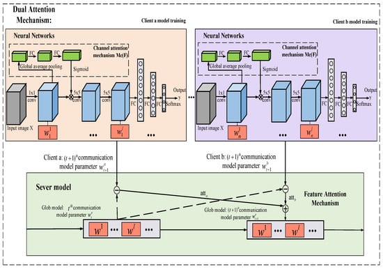 The original design concept of federated learning aims to jointly train high-quality global models on the client side without revealing privacy. For example, mobile shopping malls, banks, and other apps with high-quality customer information can recommend suitable shopping and financial products through joint model training without revealing user information. Many large enterprises have trained high-performance global models to help small and medium-sized enterprises in their later development. However, due to the imbalance of samples between clients, there will be a problem that the noise generated by clients with a large sample size when participating in the training will also significantly impact the results of the final trained global model. To this end, given the problem of large samples and considerable noise, consider adding a channel attention mechanism on the client-side, perform feature compression in the spatial dimension to obtain a feature map with a global receptive field, and then learn through fully connected layers (FC) relationship between channels. Finally, multiplying the learned weight coefficients of each channel with all the elements of the corresponding channel can help to minimize the impact of noise on the final model training results while obtaining the characteristics of the respective overall samples of each client. At the same time, federated learning joins incremental learning [48,49] to perform dynamic task training. Learning at the same tsimultaneouslyicatmttttion increments, will lead to the imbalance of sample importance and the problem that the importance of features is difficult to capture. For this reason, it is difficult to capture the imbalance of features. We consider adding a feature attention mechanism [50,51] when the global model is aggregated, to enhance the capture performance of the model training for critical feature information. Therefore, we consider adding a dual attention mechanism module that simultaneously channels attention and features attention to the federated learning framework. The dual attention mechanism module is shown in Figure 3.