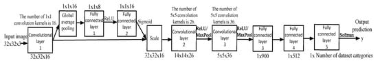 After that, we perform global average pooling on it, perform feature compression on the output image obtained through convolutional layer one along the spatial dimension, and turn each two-dimensional feature channel into an actual number, which has a global effect to some extent. The receptive field and t output dimension match the input’s feature channels put, and the number of channels C is 16. After global average pooling, the feature dimension C = 16 is reduced to the dimension C = 8 through the fully connected layer 1, and then activated by ReLU. Then the dimension C = 8 is raised back to the original dimension 16 through the fully connected layer 2, which is used here. The two fully connected layers can better fit the complex correlation between channels with more nonlinearities, and significantly reduce the number of parameters and computation. After the fully connected layer 2, a sigmoid activation function is used to obtain a normalized weight between 0 and 1, and finally, a Scale operation is used to weight the normalized channel attention weight to the features of each channel; it can help focus on the overall feature importance of the sample and reduce the impact of noise on the final model training results. The Scale operation refers to the channel-by-channel weighting of the previous features through multiplication to complete the re-calibration of the original feature map in the channel dimension. After that, we continue using convolutional layer 2 and convolutional layer 3 for feature extraction on the noise-reduced feature map. And adding add activation function ReLU and MaxPool between convolutional layer 2 and convolutional layer 3. The activation function can extract helpful feature information and make the model more discriminative, and the pooling layer can avoid overfitting by down-sampling. Finally, because two or more fully connected layers can solve the nonlinear problem satisfactorily, we input the features of the convolutional layer 3 into the fully connected layer 3 and the fully connected layer 4 to obtain a 512-dimensional vector, then go through the full connection layer. Connection layer 5 receives a c-dimensional vector (c is the number of classes in the current dataset), then inputs it into the softmax classifier for classification, and outputs the predicted value y.