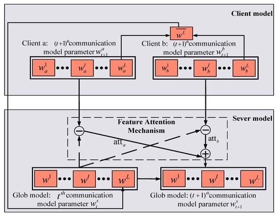 Among them, is the model parameter of the server in the tth communication, and is the model parameter of the client k in the th communication. is the distance between the two sets of neural parameters calculated using the Euclidean distance formula, is the important weight of the client model. The hierarchical soft attention method is used to capture the hierarchical importance of the neural network in multiple local models, and it is aggregated into the global model as feature attention to achieve the optimal server and client. The distance between the models is minimized, the expected function of the previous formula is derived to obtain the gradient, and K clients perform gradient descent to update the parameters of the global model.