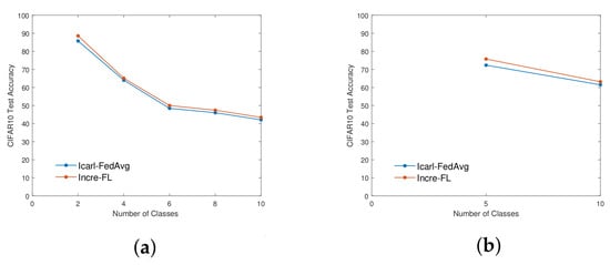 Cifar10 accuracy curve. (a) Accuracy graph when the class increment is 2. (b) Accuracy graph when the class increment is 5.