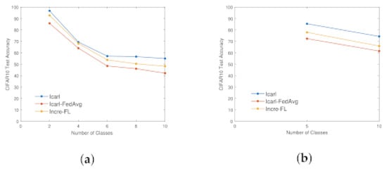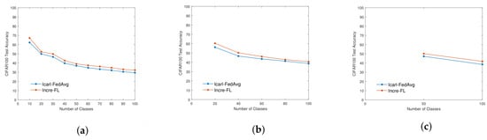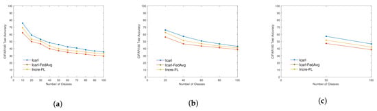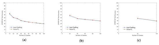 Figure 15 and Figure 16 show the test results of the algorithm in this paper, the pure Icarl strategy, and the federated averaging algorithm with the Icarl method on the CIFAR10 and CIFAR100 standard test sets. It can be seen from the figure that the average accuracy of the algorithm in this paper is significantly better than the federated averaging algorithm with the Icarl strategy and lower than the incremental learning algorithm Earl. The accuracy rate of Incre-FL is lower than that of the total learning algorithm Icarl because the gradual learning algorithm Icarl directly uses the neural network CNN to train the dataset. In federated learning, the participants will not expose the data to the server or other parties. Hence, the federated learning model performs slightly worse than the centrally trained model, and the additional security and privacy protection are undoubtedly more valuable than the loss of accuracy.