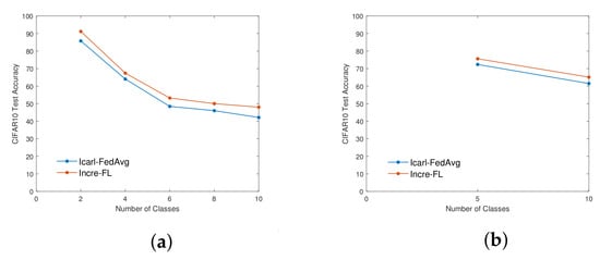 Figure 13 and Figure 14 show the test results of the Incre-FL algorithm and the Icarl-FedAvg algorithm with the feature attention mechanism added separately on the CIFAR10 and CIFAR100 standard test sets. It can be seen from the figure that the accuracy of the algorithm in this paper is significantly better than that of the Earl-FedAvg algorithm. The algorithm’s accuracy in this paper on the CIFAR10 dataset when the classification increments are 2 and 5 reaches 45.40% and 63.73%. On the CIFAR100 dataset, the accuracy rates when the classification increments are 10, 20, and 50 reach 31.02%, 39.86%, and 40.32%.