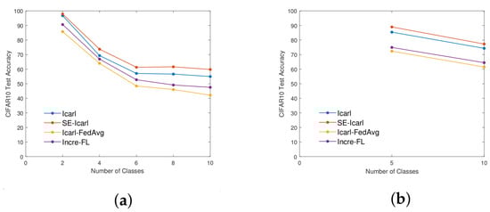 The accuracy curve of the channel attention mechanism module in the test set Cifar10. (a) Accuracy graph when the class increment is 2. (b) Accuracy graph when the class increment is 5.