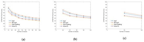The accuracy curve of the channel attention mechanism module in the test set Cifar100. (a) Accuracy graph when the class increment is 10. (b) Accuracy graph when the class increment is 20. (c) Accuracy graph when the class increment is 50.