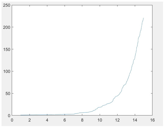 Figure 7 shows the distribution of 221 ticket-purchasing request arrival times in the Beijing South–Shanghai Hongqiao section during the pre-sale period. It is evident that the daily ticket-purchasing rate changes smoothly in the former 12 or 13 days of the pre-sale period with little difference, so there is no need to divide many periods. Therefore, the first two periods are divided according to the 10% and 20% of the cumulative probability distribution law, namely, t = 1 and t = 2. By comparison, the daily ticket-purchasing rate changes very dramatically in the last three days of the pre-sale period, which is very different from the first two periods. In addition, there is breakpoint in the daily ticket-purchasing rate on the 15th day of the pre-sale period, namely, the departure day, so the last three days are divided into two periods: t = 4 is the 15th day of the pre-sale period, and t = 3 is about the 13th to 14th day of the pre-sale period. Thus, the pre-sale period is divided into four periods. Table 6 shows the time division of the pre-sale period for each OD section.