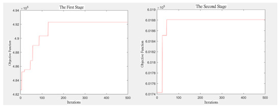 Set the particle population size popsize = 100, the maximum number of iterations should be 500, the inertia factor = 0.8, the learning factor c1 = 1.49, and c2 = 1.49. We use MATLAB R2016B software to solve the model. Figure 8 shows the iteration process of the solution. Convergence is reached in less than 200 iterations in the first stage of the pre-sale period, while convergence is reached within 100 iterations in the second stage of the pre-sale period. At this time, the objective function value does not change, and the optimal solution is obtained. The total revenue of the train during the pre-sale period is CNY 601,881.