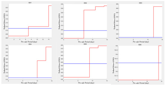 The ticket price change in each OD section during the pre-sale period is shown in Figure 9, where the blue line is the fixed ticket price, and the red line is the optimal ticket price of each period during the pre-sale period.