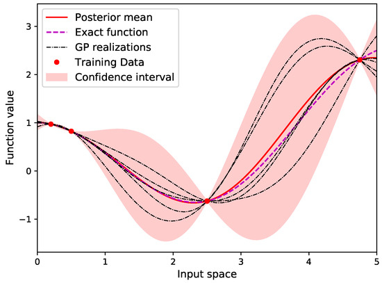 Any gradient-based or gradient-free approaches optimization algorithms may be used to solve such minimization problem to determine the optimal hyperparameter values of the GP. In addition, a closed form of the constant mean function may be sometimes be found [6,7,8,26,27]. Once the GP has been trained, the prediction at a new unknown location is done by using the conditional properties of a multivariate normal distribution (Figure 1):