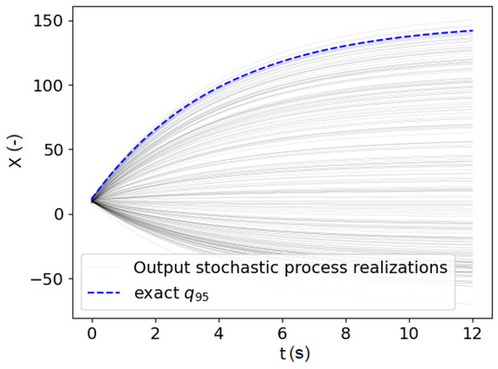An illustration of 200 output stochastic process realizations and the exact quantile are given in Figure 4. Figure 5 presents the scaled KL modes for the output stochastic process.