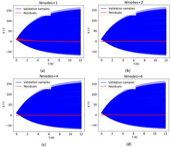 where is the number of validation samples, the exact validation sample and the KL expansion. The factor allows to evaluate the adequacy between the KL expansion prediction and the some validation samples resulting from the exact function evaluations. In the following, different number of KL modes are considered in the decomposition to analyze the influence of the truncation. For each level of truncation, the residual samples are determined by evaluating the difference between the validation samples and the KL predictions using Equation (4). The residual samples are illustrated in red in Figure 6 along with the validation samples (in blue). It can be seen in Figure 6, that by considering only 1 mode in the KL expansion, the residual samples are non negligible. However, as the number of modes increases, the residual samples become negligible and the KL expansion provides an accurate prediction.