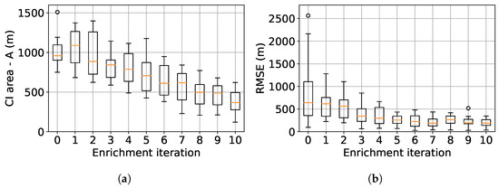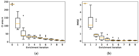 Estimation of the quantile confidence area (a) and root mean square error (b) along the 10 active-learning iterations for 10 repetitions.