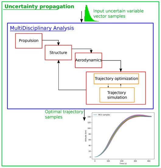 For one realization of the input uncertain modeling variables, the multidisciplinary analysis used to assess the vehicle performances consists in determining the optimal launch vehicle trajectory (optimal state variables) involving the solving of an optimal control problem. Therefore, uncertainty propagation is a challenge even in early design phases as it combines the computational cost of multidisciplinary analysis, uncertainty propagation and trajectory optimization.