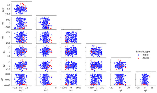 For one representative repetition, Figure 17 presents the pairplot associated with the initial and added samples for the input uncertain variables in dimension 7. The added samples by the refinement strategy are selected in specific regions of the input uncertain variable domain. For instance, trajectories with higher altitude result from the uncertainty on the specific impulse of the 2nd stage that are above s offering higher rocket engine efficiency. Similarly, the negative uncertainty on the residual mass of the structures of stages 1 and 2 allows trajectories with higher altitude. Therefore, the active-learning strategy appropriately selects input uncertain variable realizations to be added to the surrogate model dataset to improve the quantile estimation.