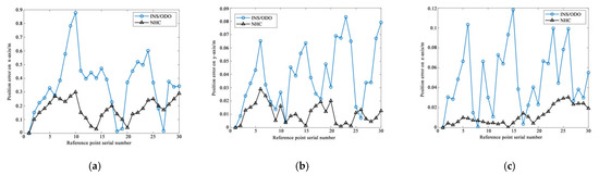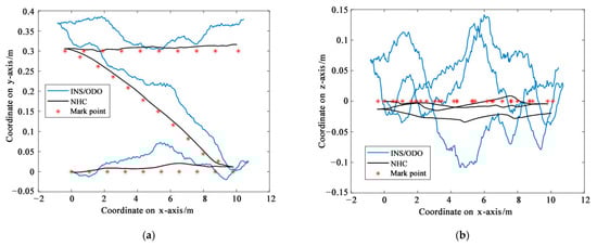 Figure 3 shows the movement trajectory of a shearer in the face’s coordinate system. It compares the trajectory of the shearer in the traditional INS/ODO scheme and the positioning method based on non-holonomic constraints which is proposed in this paper, and adds the coordinates of the marker points as a reference. From Figure 3, it can be seen that the traditional INS/ODO scheme has rapid error divergence because only the odometer can restrict the forward speed of the shearer. After adding the non-holonomic constraint, the positioning error does not diverge with time due to the increase in the motion-constraint information in the lateral and vertical direction of the shearer, which has good tracking performance for the actual track.