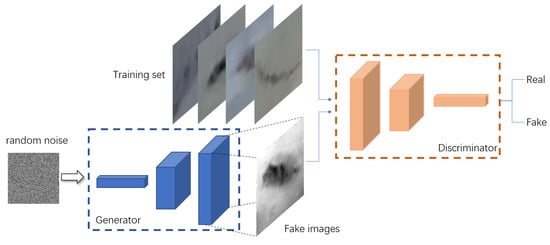 As shown in Figure 1, during training, a set of randomly generated noise vectors were first input to the generator to generate a set of false images. Then, the generated false images were input to the discriminator, together with the real images, to judge the authenticity of the images. After iteration, the discriminator could eventually not distinguish whether the images were from the real training samples or generated by the generator, at which time the GAN reached the optimal state. The objective function of the GAN is as follows:
