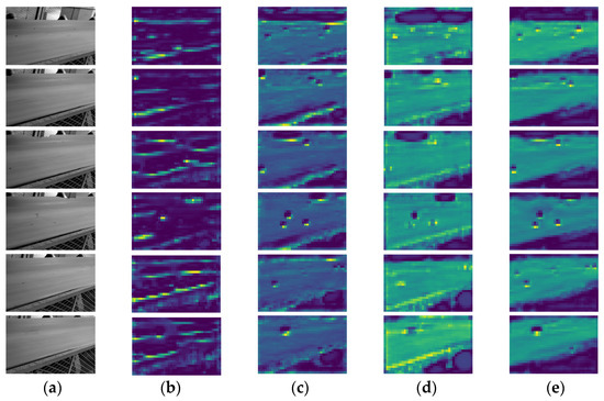 Comparison of output feature maps of different network detection heads. (a) Initial input images. (b) Feature map of YOLOv5m. (c) Feature map of YOLOv5n. (d) Feature map of YOLOv5n(KD). (e) Feature map of YOLOv5n-slim(KD).