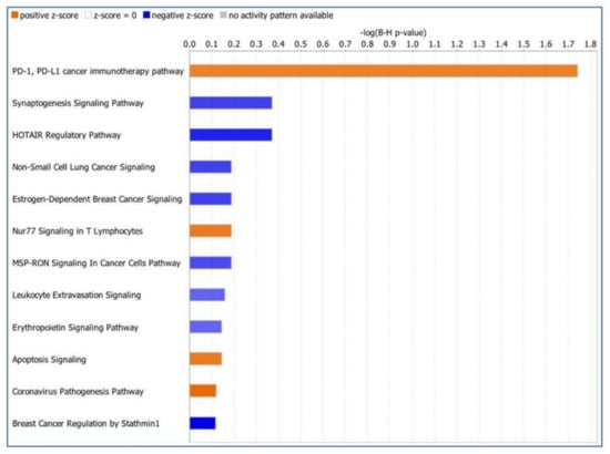 The top canonical pathways significantly affected by CNVs in GC group based on activation Z-score. The PD-1/PD-L1 cancer immunotherapy signaling pathway was significantly activated by CNVs in the GC patients. The height of the bars indicates how significant the overlap is with the known targets in one’s dataset, as calculated by Fisher’s exact test. p ≤ 0.05 was used as a cut-off to compute the Benjamini–Hochberg (B-H) correction. The color of the bar indicates whether the canonical pathway is expected to be activated (orange) or inhibited (blue). This is calculated using a z-score compared to an idealized activated pattern for the pathway.