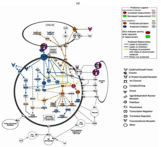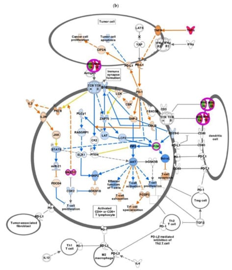 IPA has more than 700 pre-defined canonical pathways or well-understood signaling pathways for the interpretation of loss or gain functions. In IPA, pathway overlap of significant dataset molecules of the control and GC groups with canonical pathways that are likely activated or inhibited can be obtained. IPA uses an algorithm that relates the effect on the gene from the mutation in the dataset to the pattern anticipated for the specific canonical pathway if it was activated. To understand the variant effects on these well-known pathways, canonical pathways were investigated using IPA to predict the involvement of signaling pathways in the control and disease groups. In the GC group, the PD-1/PD-L1 immunotherapy pathway had the highest impact on the canonical pathway. In line with our findings based on IPA, a high-throughput knowledge discovery platform, several studies have shown that PD-1 and PD-L1 are overexpressed in GC tissues [,,]. Increased PD-1/PD-L1 expression augments the growth of GC cells []. Furthermore, our in silico validation study using iPathwayGuide, another NGKD platform, based on RNAseq data derived from GC patients (14), proved that the genes implicated in the PD-1/PD-L1 pathway was differentially regulated and reduced T-cell activity and increased T-cell apoptosis and effector T-cell development.