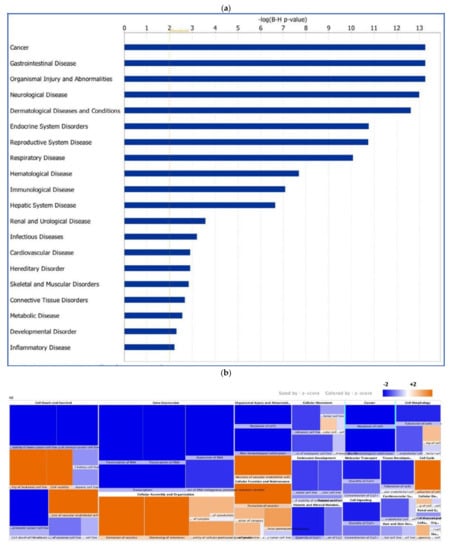 The genetic gain- or loss-of-function data from the normal healthy control and GC groups were imported into Ingenuity Pathway Analysis (IPA) software (Qiagen, USA). IPA is a web-based software application developed and maintained by Qiagen, USA. It uses a curated backend knowledge base that is regularly updated based on the latest literature and state-of-the-art next-generation backend algorithms to analyze, integrate, and interpret high-throughput data derived from variant effects analysis, RNA sequencing (RNA seq), metabolomics, proteomics, MicroRNA, and SNP microarrays. Downstream effects analysis in IPA predicts cellular and molecular biofunctions, diseases and disorders, and other phenotypes regulated by patterns in control and test data sets. Loss or gain of activity of a gene was assigned on a scale of −2, −1, 0, 1, 2 to indicate how much each gene has lost or gained activity due to mutation in both groups before uploading the datasets into IPA. The core analysis module was selected to identify significant downstream effects on canonical pathways, diseases and biofunctions, tox functions, pathological functions, etc. [,], in the control and GC groups separately. Fisher’s exact test with a p-value cut-off ≤ 0.05 and a minimum of p ≤ 0.05 and p ≤ 0.01 to compute the Benjamini–Hochberg (B-H) corrections was used to calculate statistical significance for the canonical pathways and diseases and biofunctions, respectively. Fisher’s exact test is computationally less rigorous and commonly used. In IPA, the Fisher’s exact test was used calculate the p-value in IPA analysis since the computation depends on the random statistical model or null model. The random model correlates a random selection of a group of molecules (N) and tests if this group is enriched significantly in a specific annotation in the functional analysis.